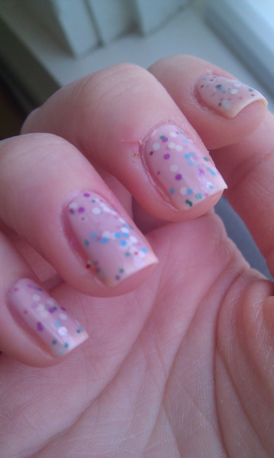 Eeek! I can honestly say that I love this mani so much! I wore it for two days and was staring at it the whole time! I can't take credit for it though, I saw this design on another blog. Sarah from Chalkboard Nails did this layering mani and I immediately needed it on my nails! You can see her origional design here. I went out and bought Sally Hansen Glass Slipper and Revlon Royal just for this mani. This is neat because it creates the effect of blue flakies.